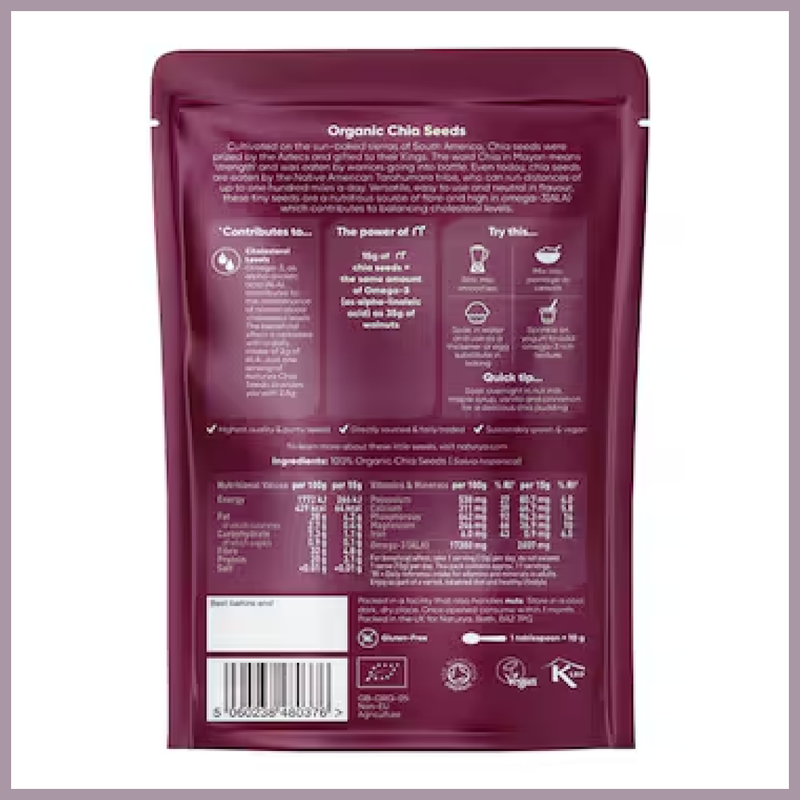 Naturya Organic Chia Seeds are cultivated on the sun-baked sierras of South America. These potent little bundles of energy have been used as an essential ingredient for centuries, as they are rich in omega 3, as alpha-linoleic acid (ALA), fibre & phosphorous, magnesium and protein.