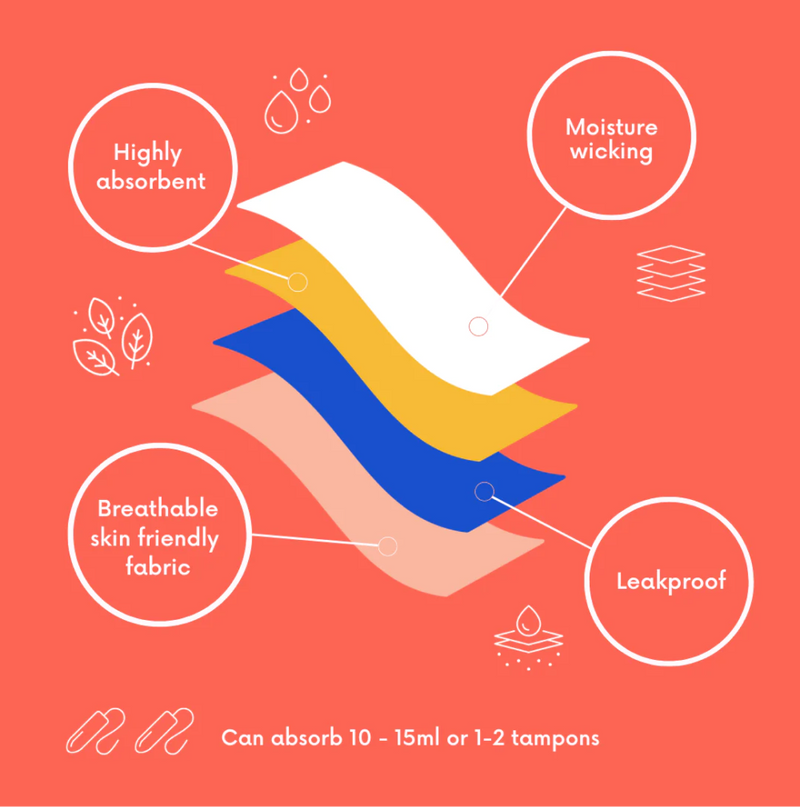 The four layers of discreet, absorbent gusset hold 15 ml (around 3 tampons), giving you leak-free protection for periods, bladder leaks, discharge and sweat.
